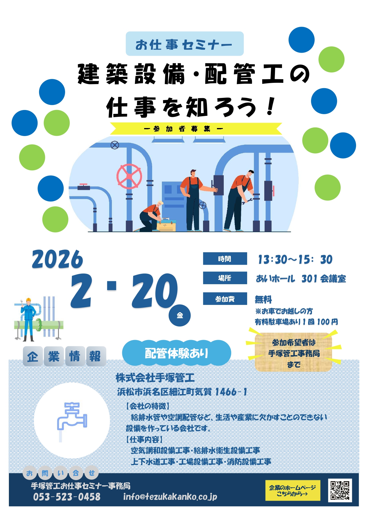 お知らせお仕事セミナーを開催します 弊社の仕事内容をより深く知っていただくために、「お仕事セミナー」を開催します。 「配管の仕事は、実際にはどんなことをするの?」と聞かれることがよくあります。 配管は建物内に空気や水の通り道をつくるとても重要な仕事です。 当日は実際に配管の仕事を体験していただける内容もご用意しています。 少しでもご興味のある方は、ぜひお気軽にご参加ください。